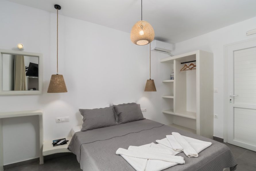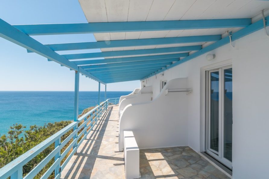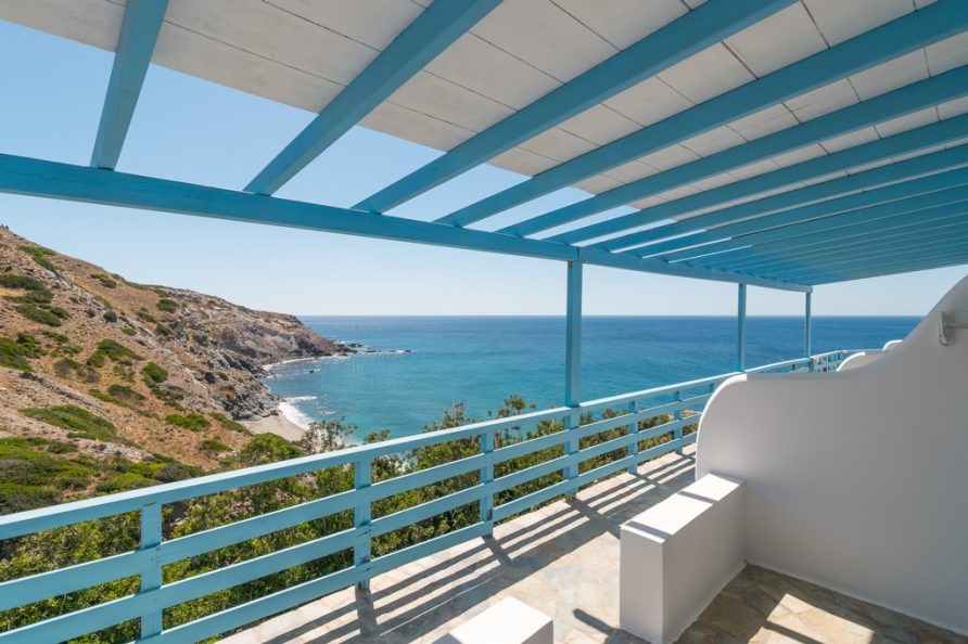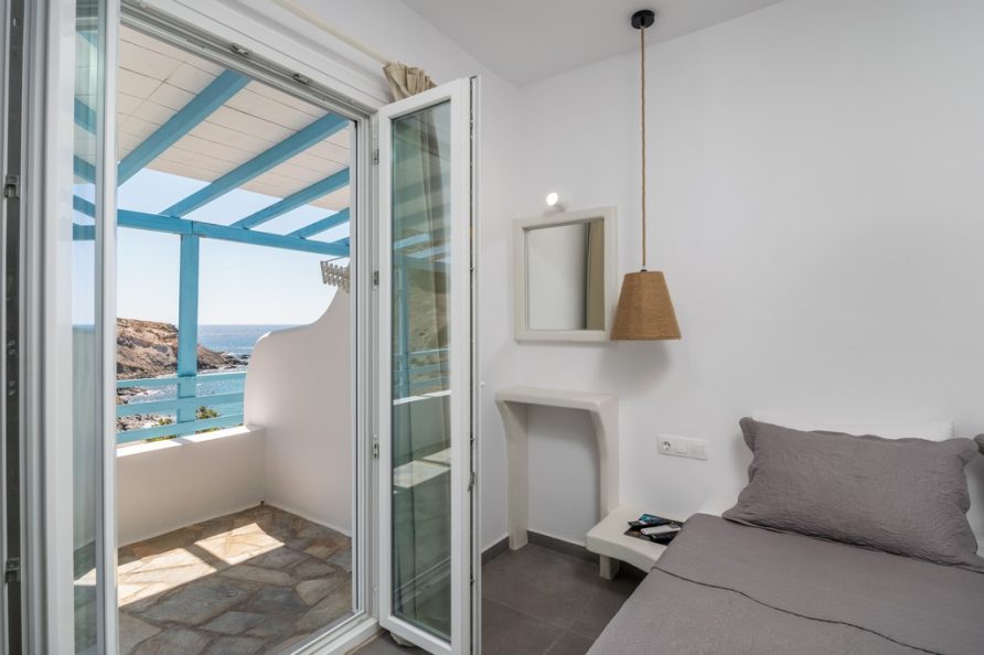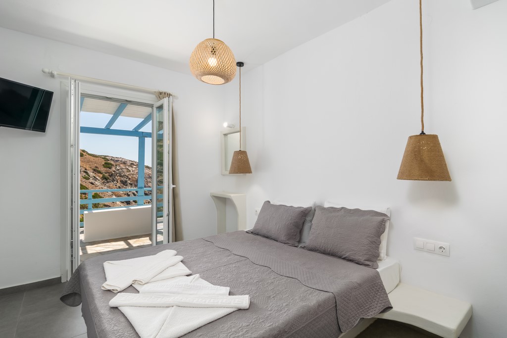 All rooms have a private balcony overlooking Psarovolada Beach. Access to this beach is via a small and steep path.