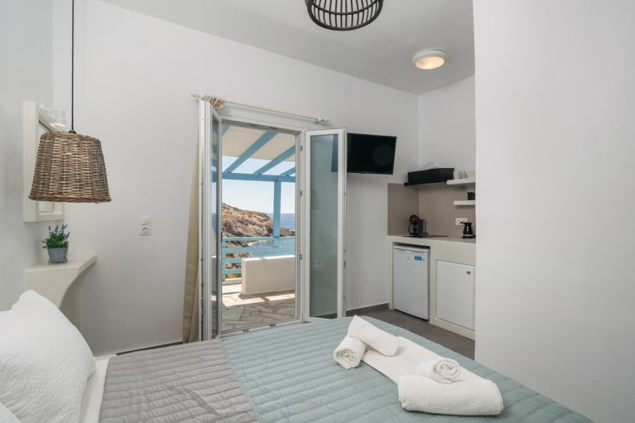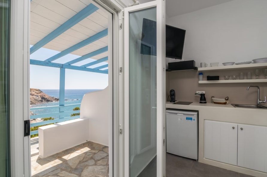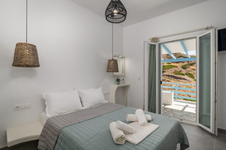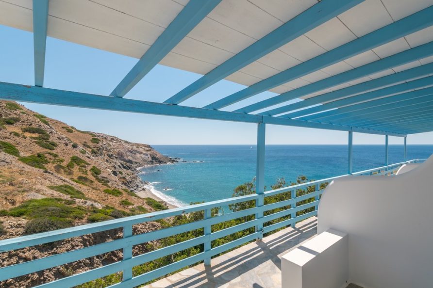 All rooms have a private balcony overlooking Psarovolada Beach. Access to this beach is via a small and steep path.
