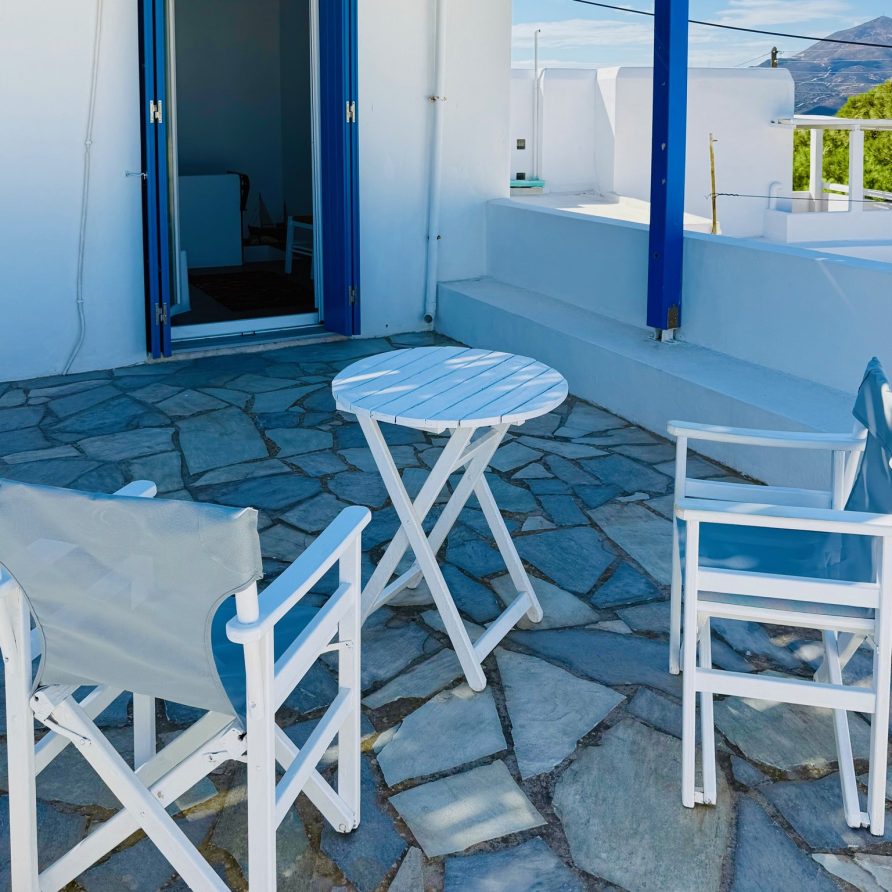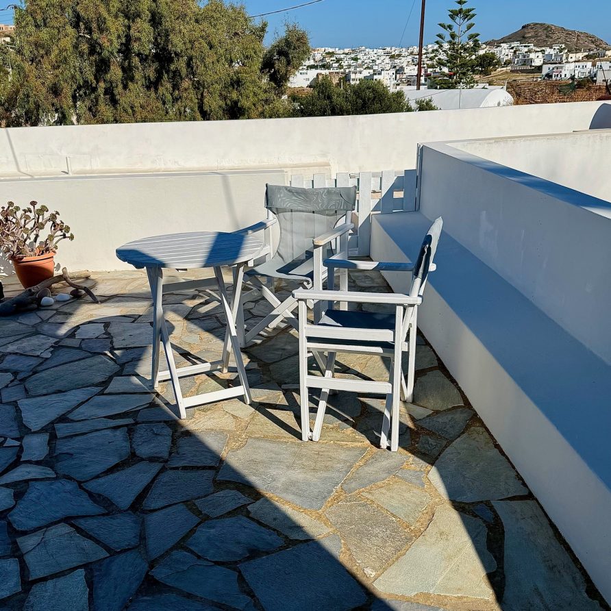 Peaceful studio in Trypiti, Milos with spacious private terrace and village views. Ideal for couples seeking quiet holidays away from the crowds. A car is strongly recommended due to the sloped village access.